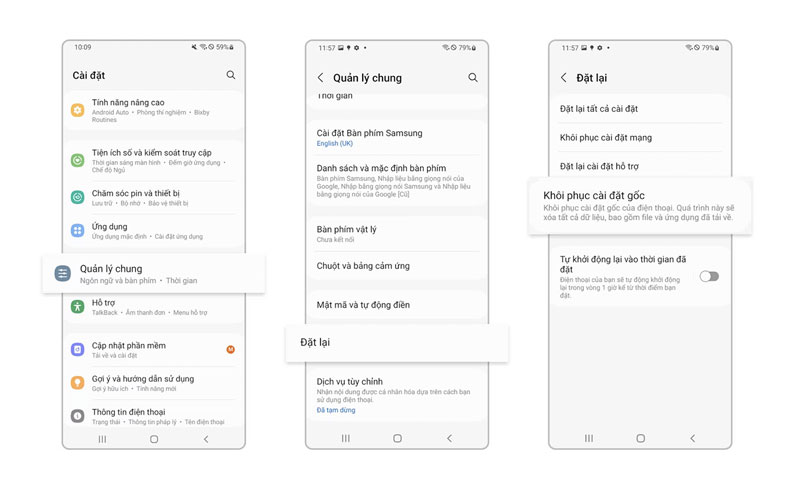 Để phục hồi cài đặt gốc cho điện thoại Samsung, bạn thực hiện các bước sau: